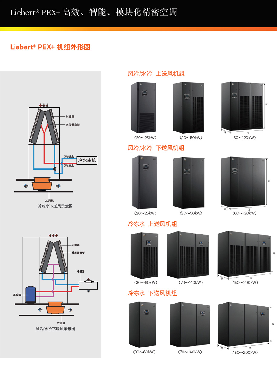 Liebert PEX 機房專用精密空調(diào)包括風(fēng)冷、水冷、乙二醇冷、風(fēng)冷/冷凍水雙冷源、水冷/冷凍水雙冷源、Free Cooling自然冷、冷凍水、冷凍水雙盤管等多種型式。制冷量范圍寬,風(fēng)冷、水冷、乙二醇冷機組20kW~100kW,冷凍水機組28-200kW。高可靠性、高靈活性、全壽命成本。完全滿足大,中型交換機房,移動機房,數(shù)據(jù)中心等高標(biāo)準(zhǔn)要求。